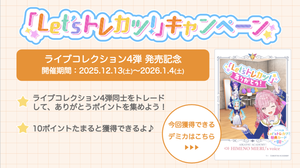 ライブコレクション4弾の発売を記念して「Let’s トレカツ!」デミカGETキャンペーンを行います。